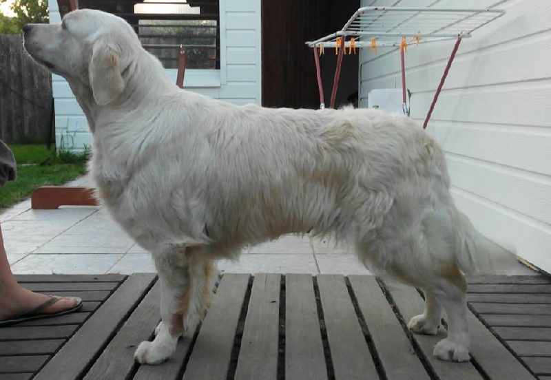 Bon modèle dans le type, tête correcte. Correctement construite Encolure bien dégagé, Angulatations AV et AR correctes, exc cage thoracique. Pieds et applombs corrects, exc robe. Mouvements corrects